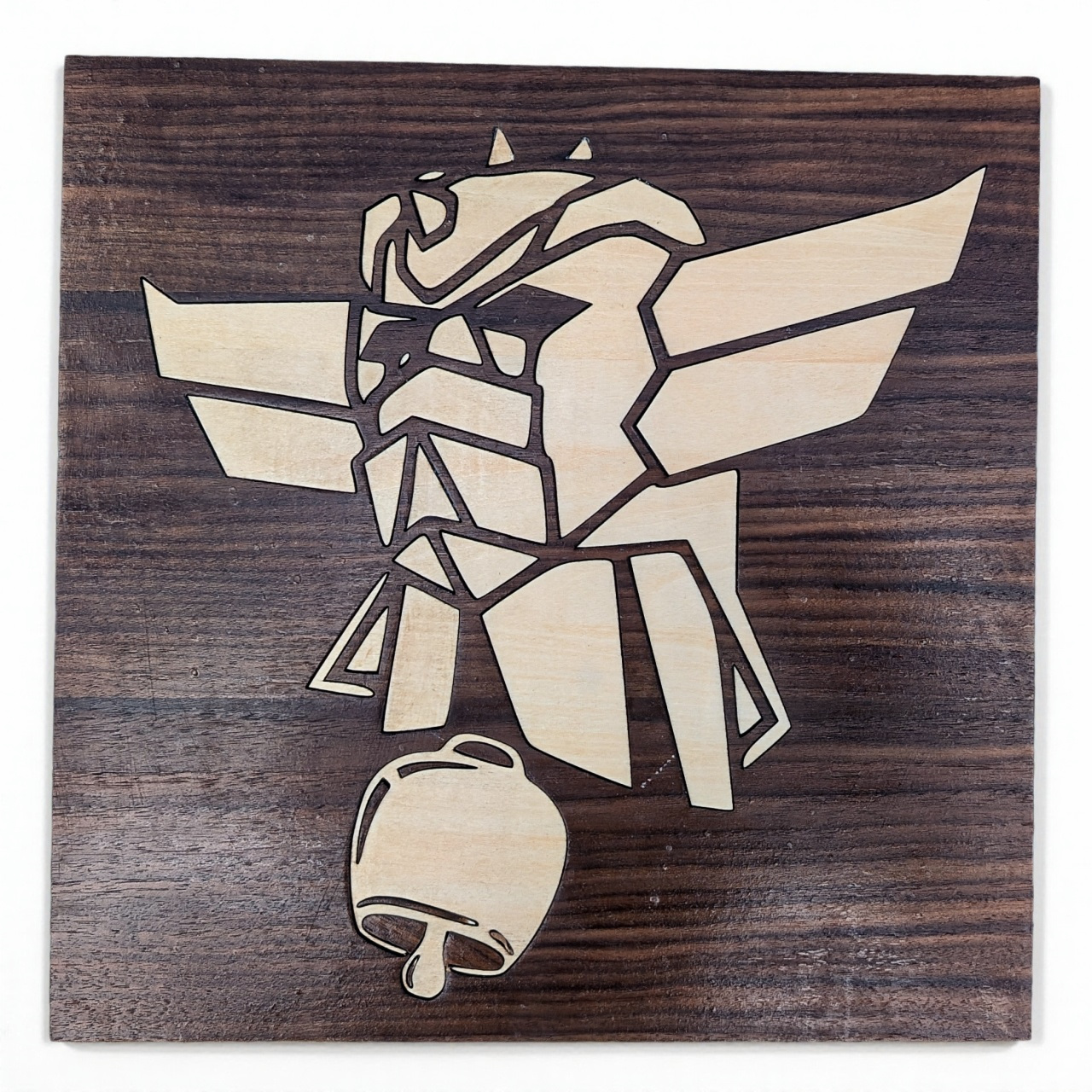 Fleur de Vie en bois de deux couleurs différentes, style marqueterie en contreplaqué brun « noyer » et clair « tilleul », diamètre de 28cm. Trois variation possibles, trame claire ou foncée sur un côté, ou les deux côtés sur une base unique pour un objet suspendu.